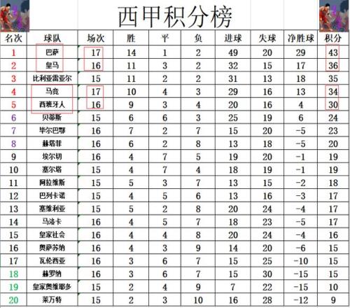 西甲最新积分战报巴萨豪夺7连胜领先皇马7分黑马赢球紧追马竞