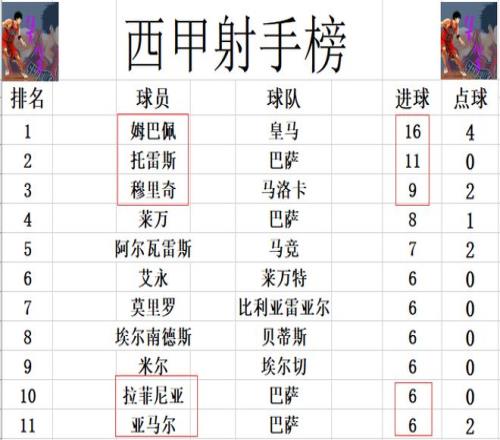 射手榜方面,姆巴佩16球高居榜首,托雷斯5球之差位列第2。穆里奇今天打入一球,超过莱万独居第3,莱万8球第4。拉菲尼亚梅开二度,追上亚马尔,米尔,埃尔南德斯等人,6球刚好挤入前十。